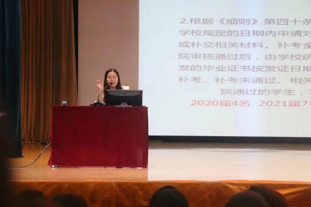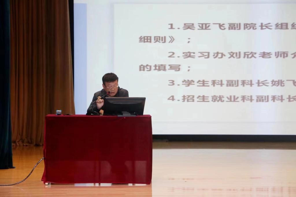 会议在今年会全体参会师生奏唱国歌的庄严气氛中拉开帷幕。吴亚飞向同学们详细解读了《中华人民共和国职业教育法》《高等职业学校普通护理专业顶岗实习标准》《职业学校学生实习管理规定》中关于实习的相关规定,结合多起实习期间案例进行了分析,让学生从国家法律、规定层面认识到实习的重要性和严肃性。刘欣为学生讲解了实习流程和实习考核手册的填写要求,姚飞向同学们强调了实习期间租房、财产、人身安全等内容,何宇带领大家一起学习了当前就业形势,号召大家珍惜实习生活,依靠自己的努力为将来就业打好坚实基础。张成做实习总动员,希望同学们严格遵守实习管理规定,将实习安全放在首位,脚踏实地完成实习任务,预祝同学们诸事顺利,未来可期。