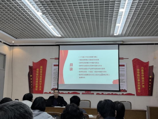 张王孝从党的二十届三中全会背景与意义、党的创新理论与路线方针政策、教师在民族复兴中使命与担当、教师在全民深化改革中创新与作为,以及教师在全面建设社会主义现代化国家新征程上奋勇争先等七个方面,为支部全体党员讲授了一堂内容丰富的精彩党课。在讲解过程中,张王孝鼓励党员们要将全会精神与自身的学习、工作和生活紧密结合起来,明确新时代的使命任务,积极行动起来,提高认识,立足本职,奋发有为。