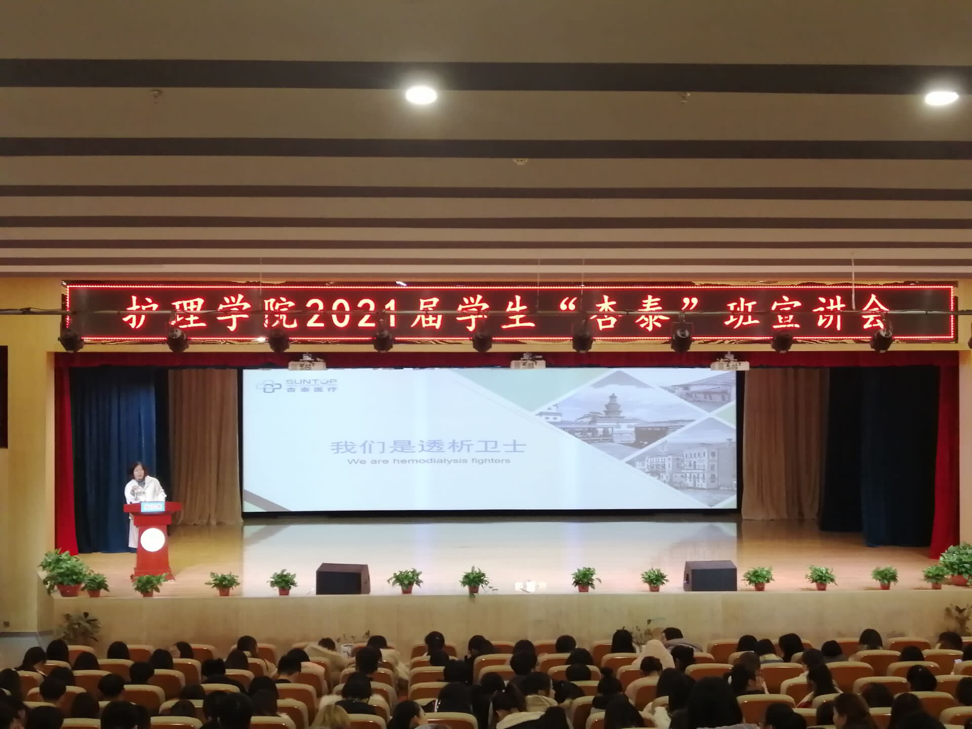 为拓宽学生实习就业渠道,提高学生职业素养,12月9日下午,今年会在图书馆报告厅举行了2021届学生“杏泰”班宣讲会,我院副院长吴亚飞,教学管理科副科长李晓乾,王媛等教师代表及2018级高职全体学生参加了宣讲会。宣讲会由“杏泰血透”订单班主要负责老师蒋婵婵主讲,吴亚飞主持了宣讲会。