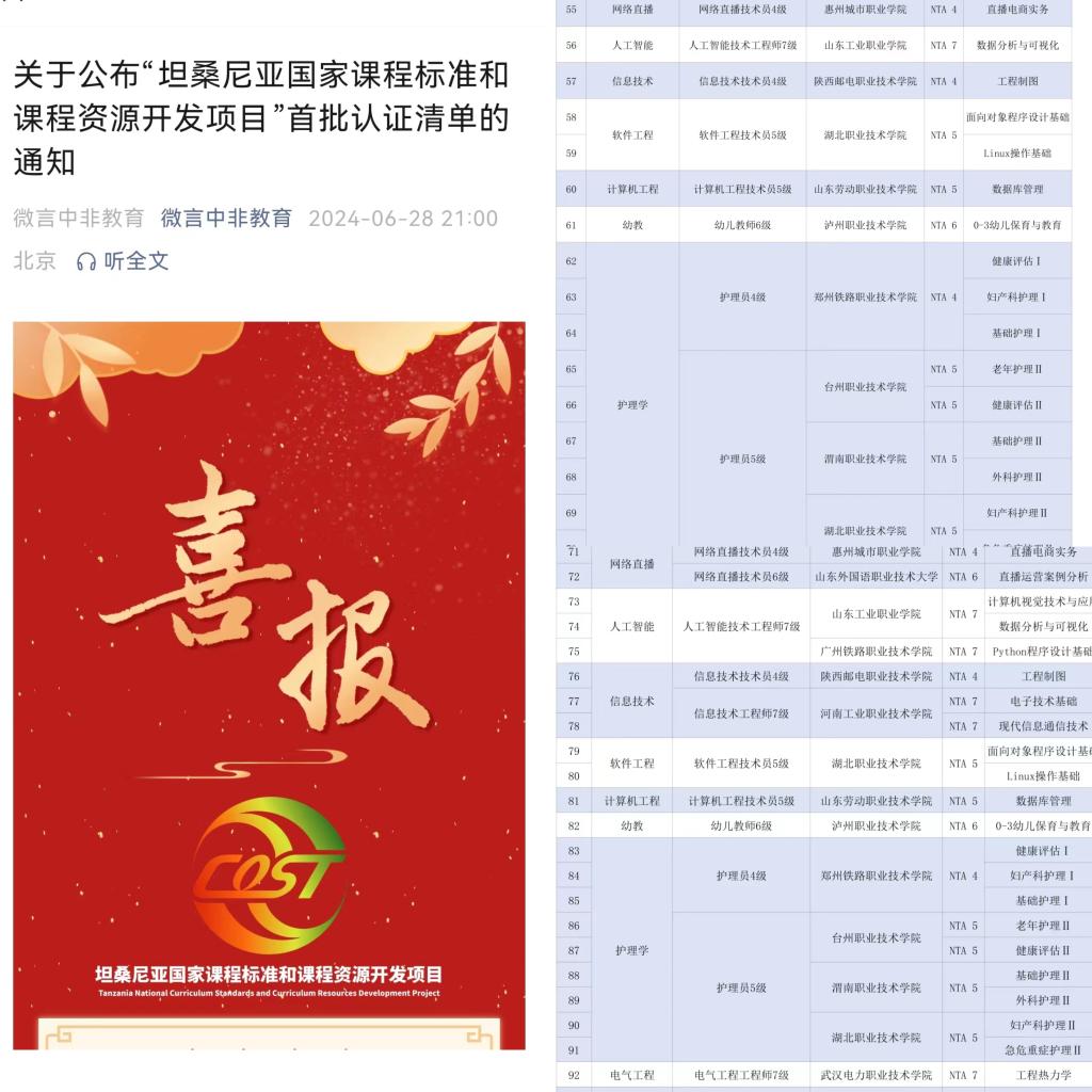 2023年9月中非职业教育联盟组织启动了“坦桑尼亚国家课程标准和课程资源开发项目”,今年会官网护理专业NTA5级《护理学Ⅱ》和《外科护理学Ⅱ》两门课程积极申报立项。立项以来,学校领导高度重视,相关部门大力支持,今年会与中非职业教育联盟紧密配合,课程负责人李丰收和席卫娟老师快速反应,组成合作项目课程小组,组织团队人员多次召开专题会议,各成员均具备高度负责态度,以扎实课程、充实内涵、为学校打响课程品牌为己任,团队人员先后研讨、撰写、修改、定稿,和合作方专家多次交流,历经三稿,完美完成本次对外课程输出项目。2门课程标准已被坦桑尼亚国家职业教育委员会审核认证,并签发认证函。