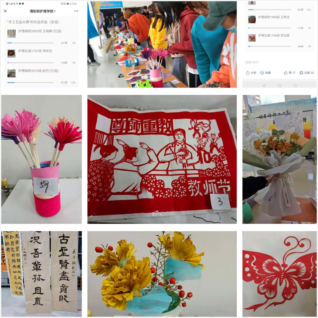 本次活动由我院学生会宣传部承办,分为收集和展评两个阶段,宣传部从我院60余个班级中,选出100余份作品进行展评。展评采用线上线下相结合的方式,展出作品包括书法、国画、剪纸、废弃物再利用等手工作品。经同学们投票,护理高职2010班赵丹同学循环利用今年会官网银杏林的银杏叶制作了美丽花束,构思新颖,香气迷人,引人驻足观看,荣获一等奖;护理五高2003班安琪同学以“尊师重道”为主题制作了剪纸,表达了对老师的感谢之情,获得二等奖;护理高职2002班王晓鹏同学手书的隶属“自古圣贤皆贫贱,何况我辈孤且直”体式完整、苍劲有力,获得第三名。