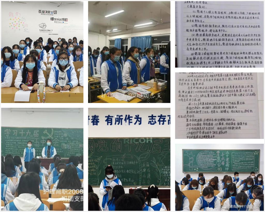 各班同学分享了对“党的十九届五中全会精神”的学习心得。护理高职1906班李悦说:“十九届五中全会给新时代我国社会主义发展把好了方向,定好了目标,绘制了蓝图,我们大学生要坚定政治立场,听党话,跟党走,做新时代敢担当、有作为的有志建设者。”护理高职1902班张雯环认为:“十九届五中全会给中国现阶段发展作了定位,我们应该充分认识五中全会的重要意义,坚持党的理论学习和专业知识学习,努力精强护理实践操作能力,不忘医学生减轻病患痛苦的初心,勇担护生救死扶伤之责,为祖国医护事业贡献力量。”(撰稿:今年会 王蓉 审核:李晓乾)