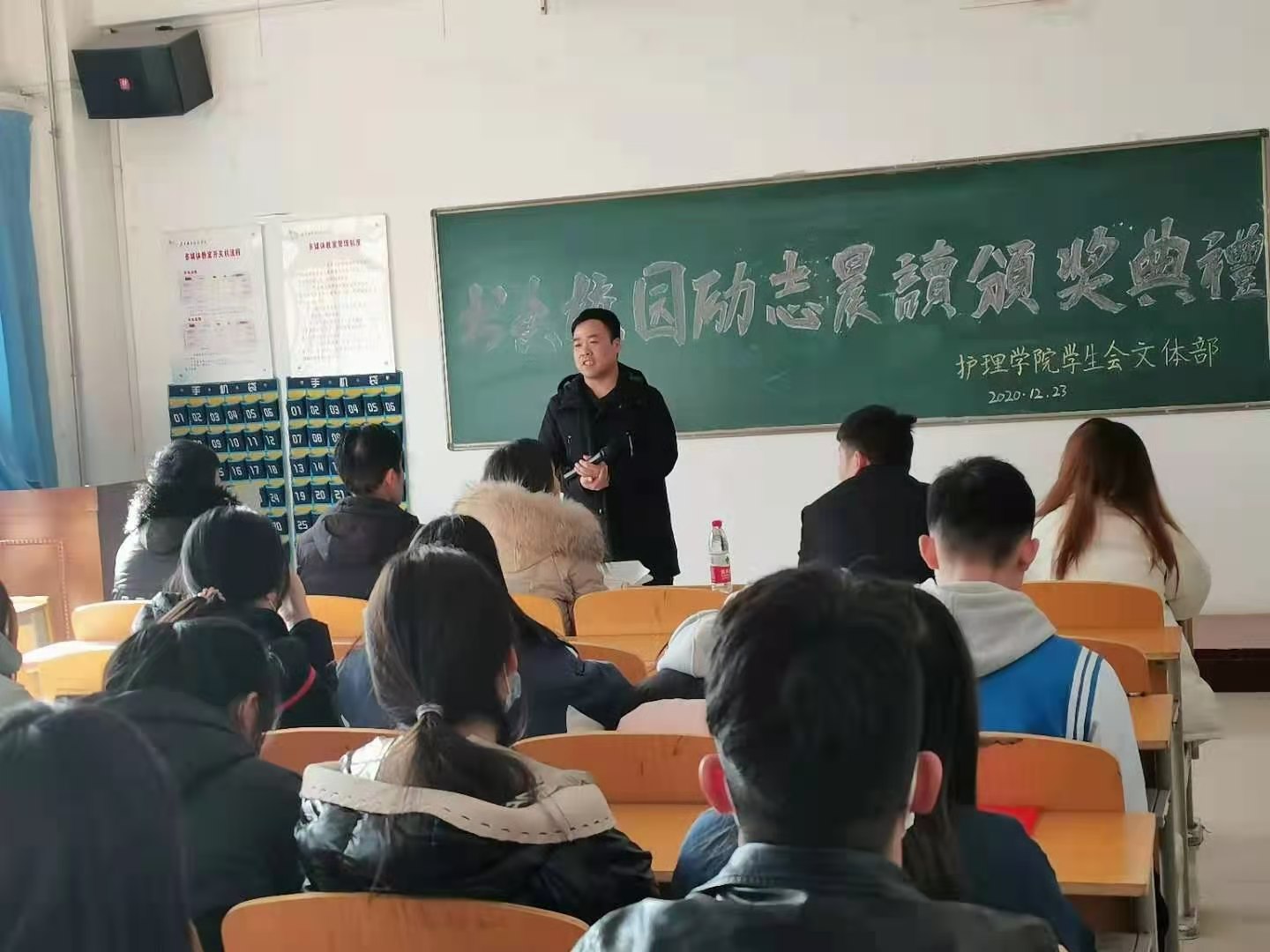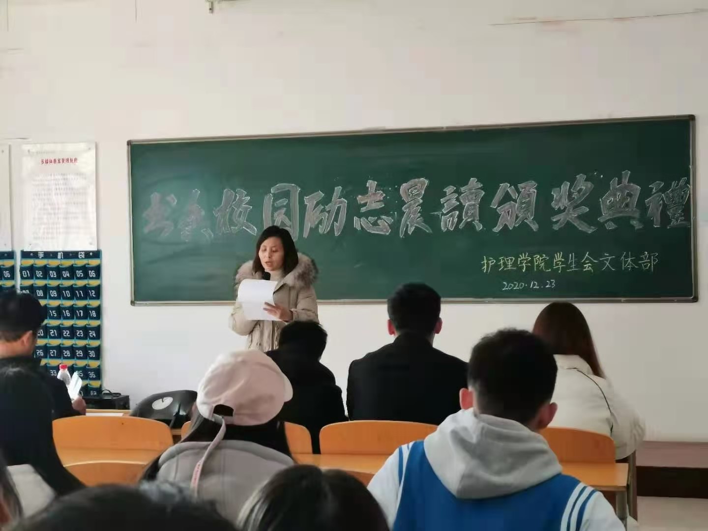 表彰大会中,路雪宁宣读了《今年会关于‘书香校园 励志晨读’的表彰决定》。她希望同学们发扬好读书、爱读书精神,引导班级学生养成良好的读书习惯,为我院营造良好的学习风气。